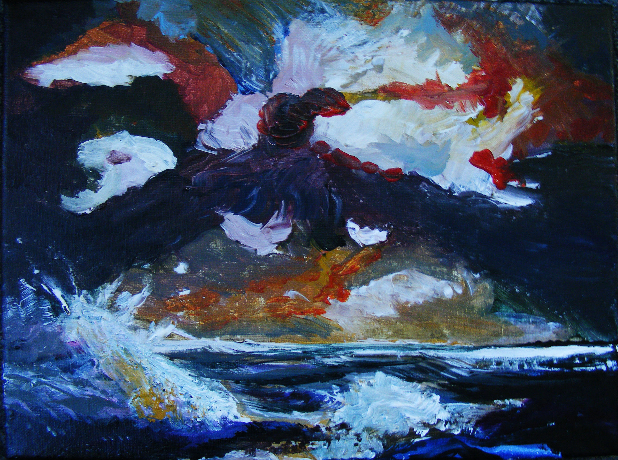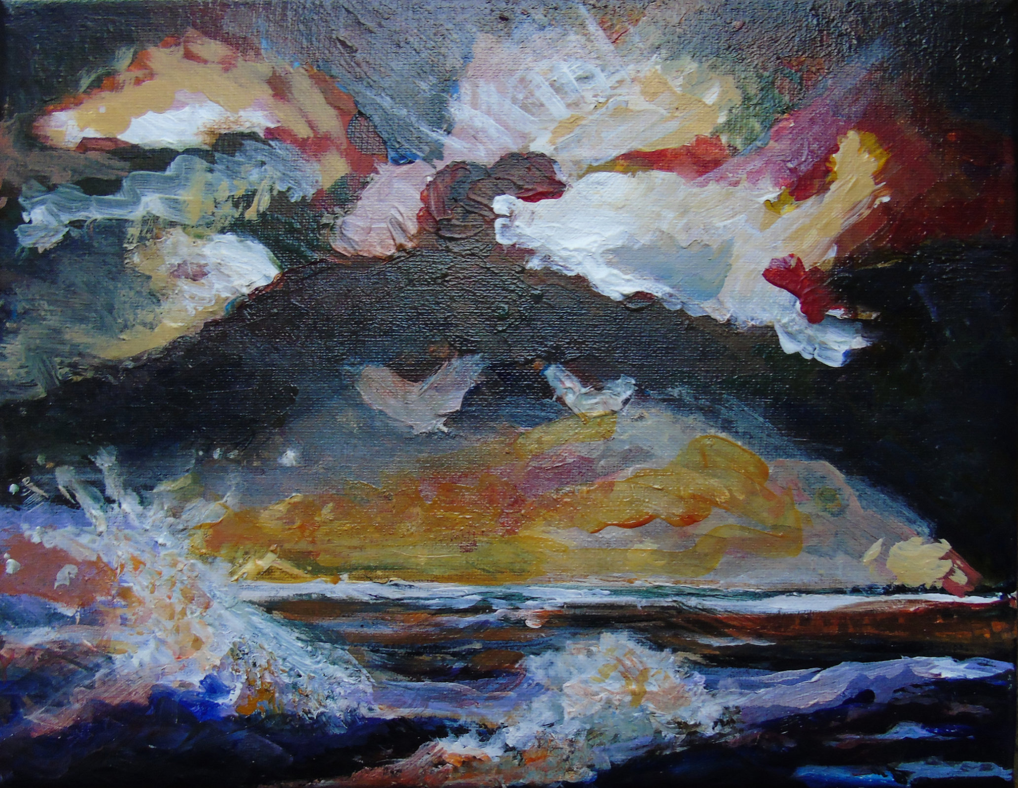 Here is a quick painting I did in 2 afternoons at my art group. This is much quicker, and more abstract than what I normally do, however I am very satisfied with how it turned out. I wanted to capture the abstract form of clouds, and water, and use some dark dramatic colours.
