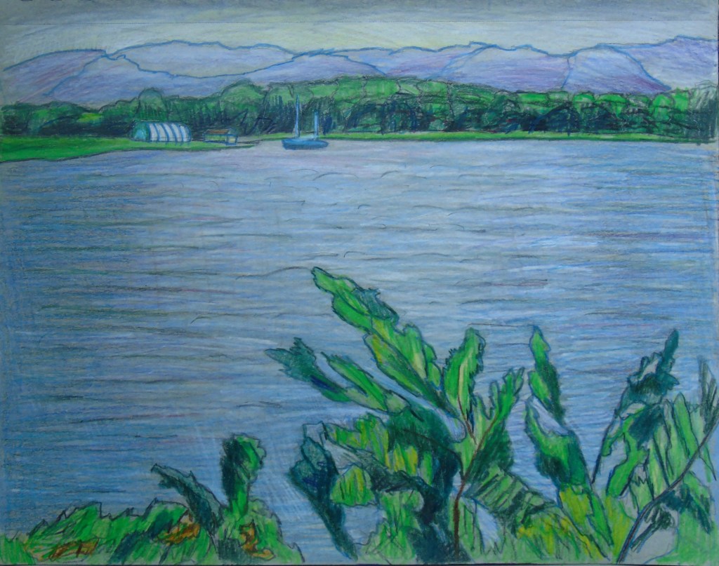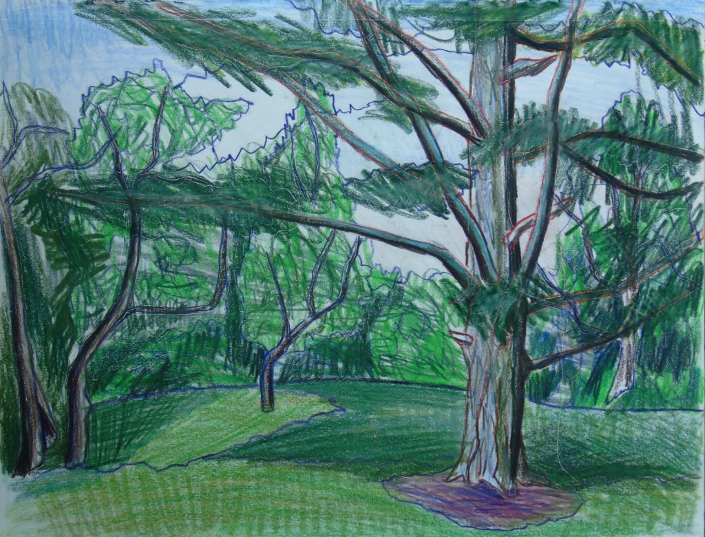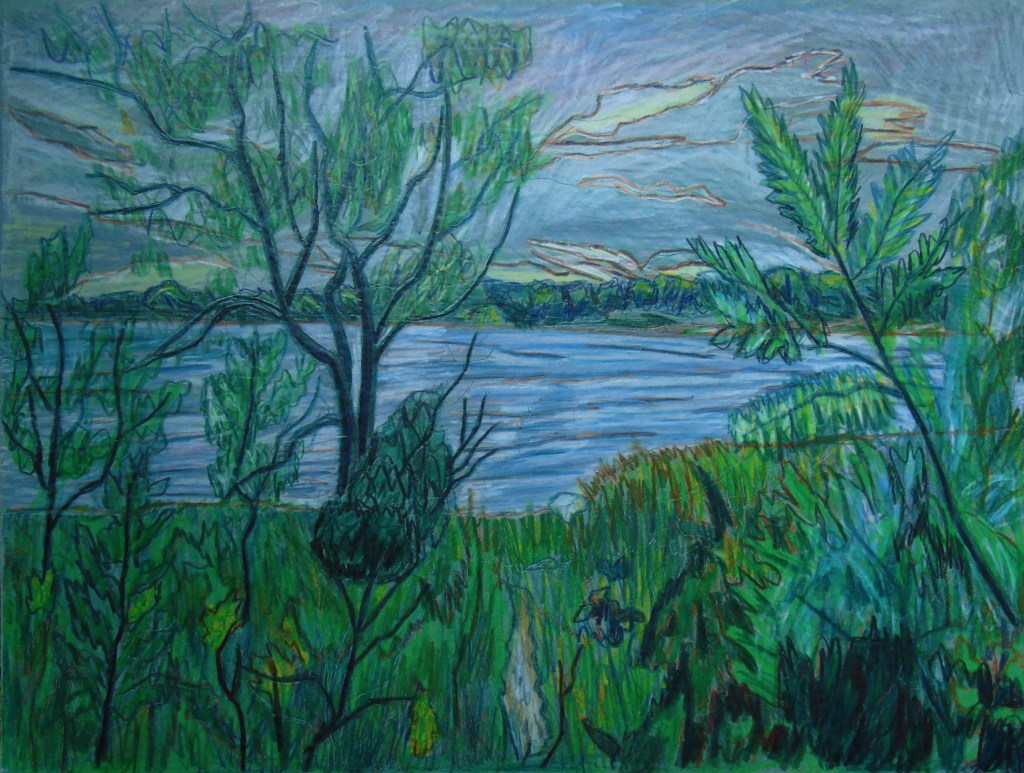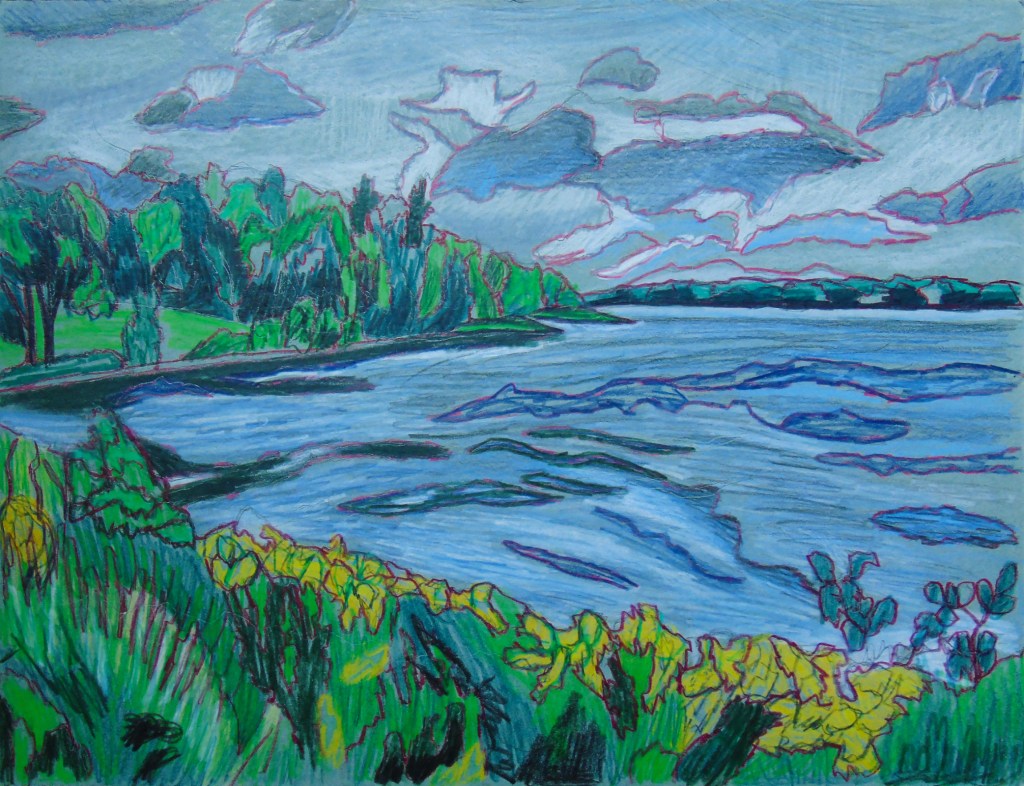 One interesting thing involving art recently is that I started going back to a studio once every week. One of those places where you pay a small fee, bring your own supplies and talk to other artists. After 2 years of Covid Restrictions, I really needed this new outing. I also visited a Cabin in July and created a Plein Aire Sketch of the pine tree “Woodlands Pine.” I also included 2 takes on the same scene. “Long Sault Marina” as a normal colour version, and a monochromatic blue version.