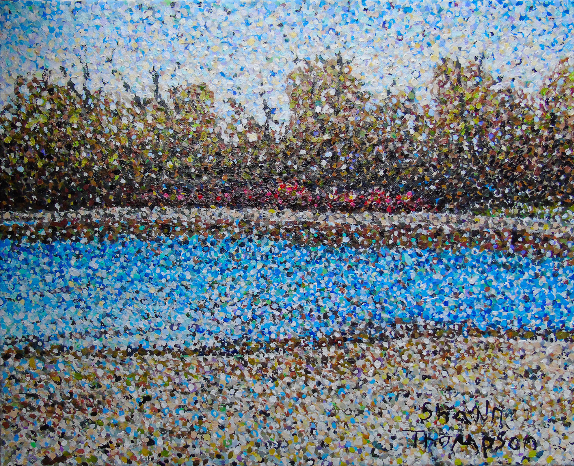 Blue Waters of April Pointillism 20″ x 16″ 2016 Acrylic on Canvas.