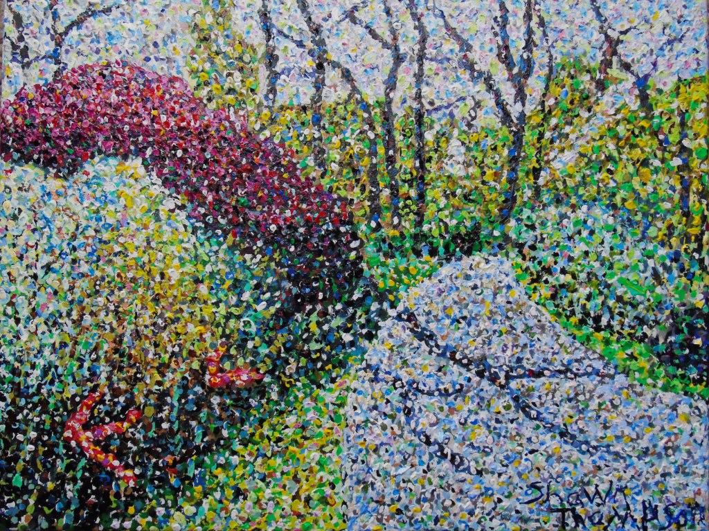 Trillium Pointillism, Acrylic Painting 16″ x 12,” 2019. Acrylic on Canvas.