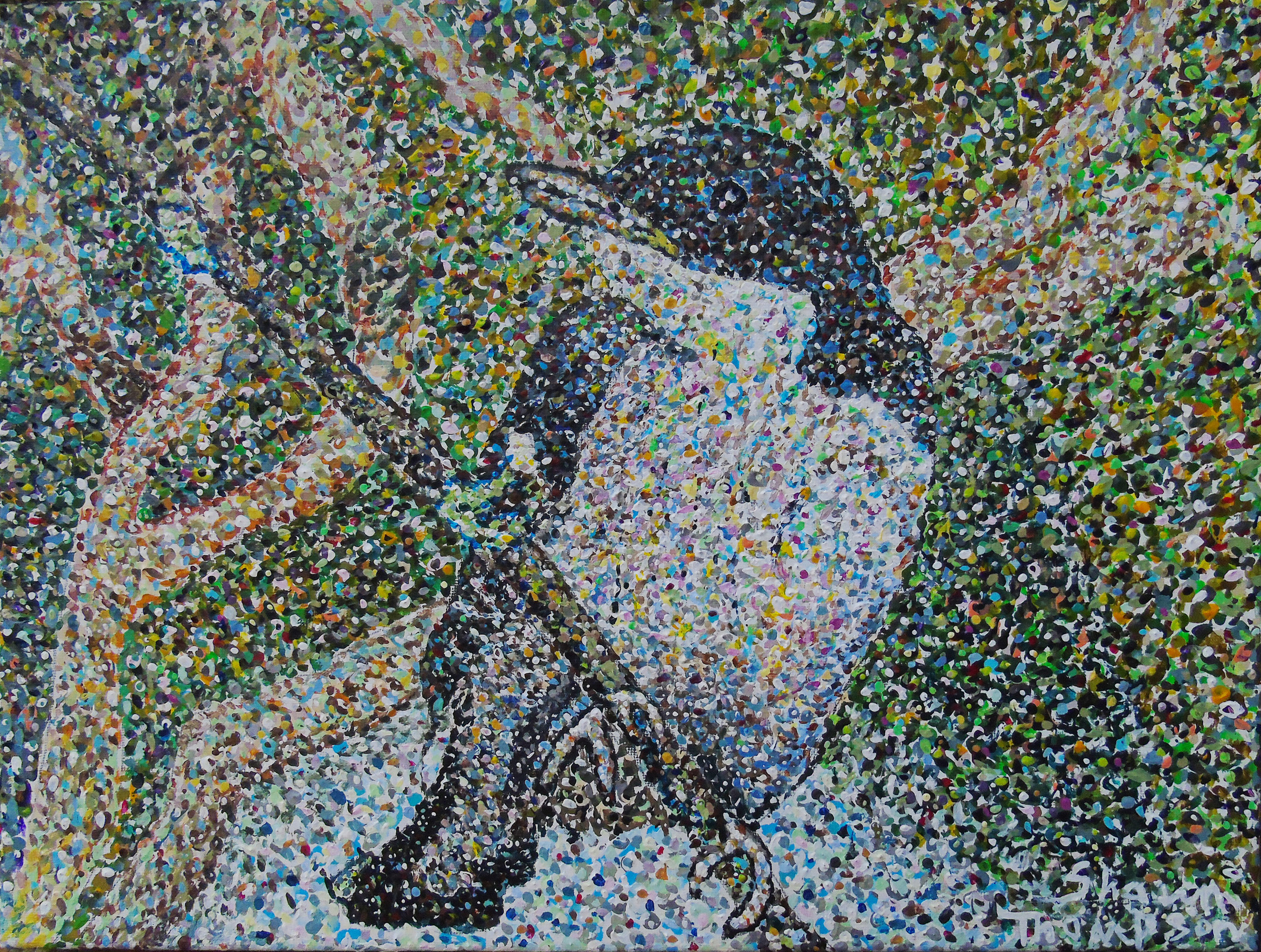 This painting is painted a bit more loosely than some of my acrylic pointillism paintings and the looseness adds to the blending in the eyes. This painting has a great sense of depth with the Tulips and the front of the painting being massive and then as you go back they recede very rapidly in their scale.